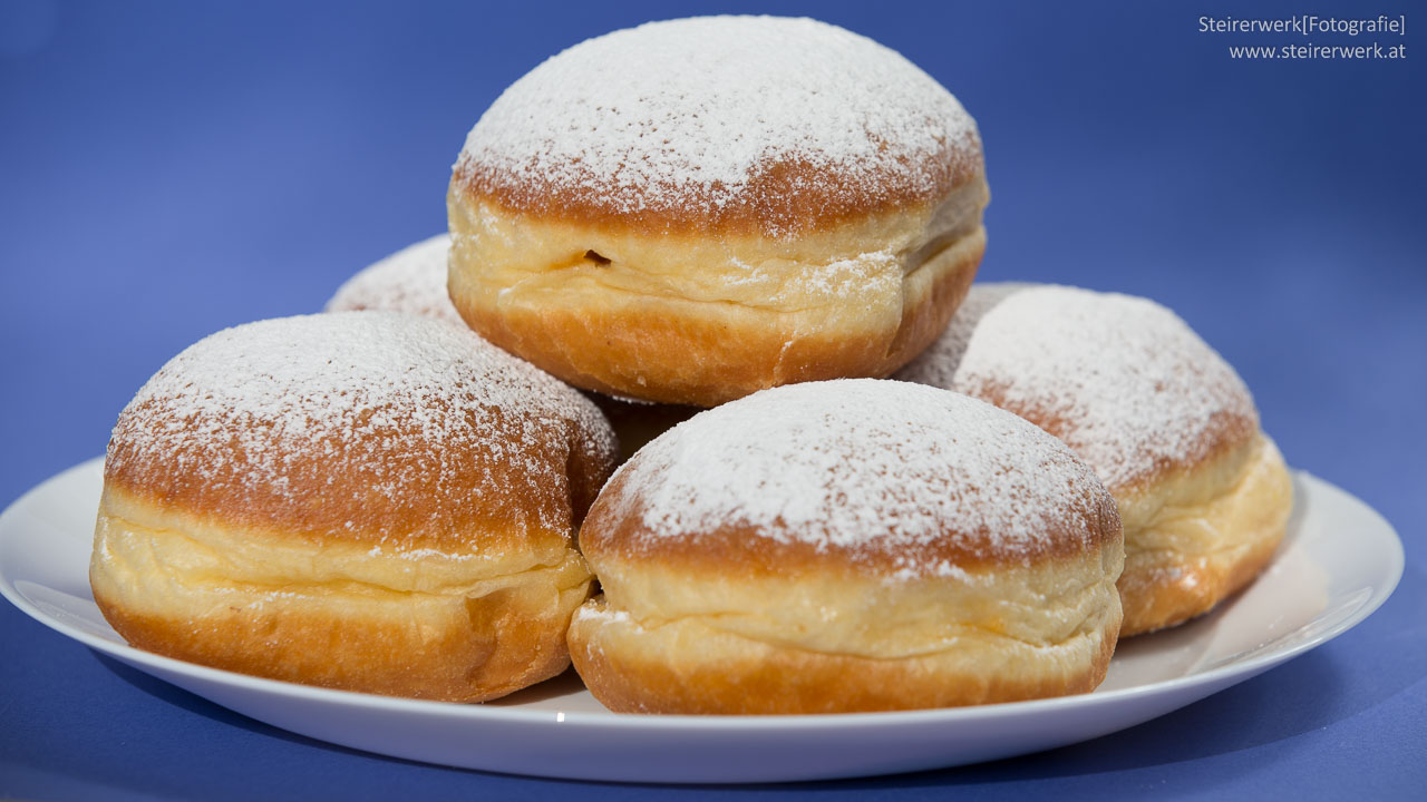 Faschingskrapfen mit viel Staubzucker vom Bäcker. In Deutschland werden die Krapfen übrigens als Berliner bezeichnet.